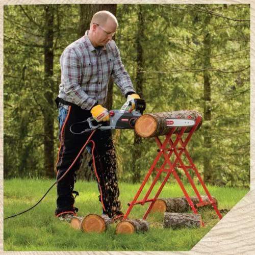 Chevalet de sciage robuste, léger et portable, idéal pour couper du bois à la tronçonneuse. Sa surface dentelée s'accroche à la bûche de bois pour la maintenir en place et assurer une coupe parfaitement stable. Largeur ajustable jusqu'à 27 centimètres. Fabriqué en acier peint, il résiste à la rouille et à la corrosion. Facile à assembler. Mode d'emploi inclus (clé non incluse).