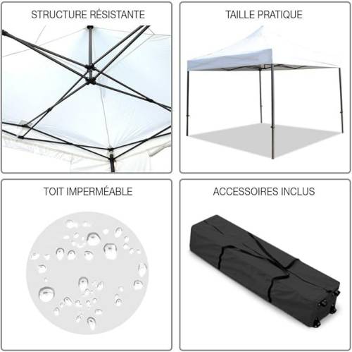 Utilisée sur les marchés, les manifestations associatives, les loisirs, pour les travaux en extérieur, dans les jardins... Toile étanche en polyester de 250g/m² et traitée anti UV 30+ pour une protection optimale. Pieds soudés sur petites plateformes métalliques équipées d'un trou pour une fixation par sardine ou lestage. Pieds télescopiques dont le réglage se fait par goupille de verrouillage sécurisé. Livré avec housse de rangement avec roulettes.
