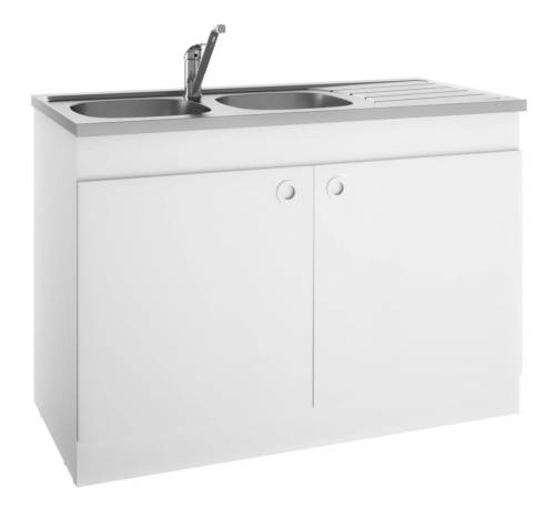 A poser au sol. Tourillonné collé, entièrement assemblé, prêt à déplier, plancher articulé. Portes battantes. Côtés et façades PPSM* blanc 16 mm, 4 chants plaqués. Dos, semelle, 1/2 étagère et plinthe : PPSM* blanc 16 mm, chants apparents plaqués. Dos amovible, fixé par boîtiers rasants, qui permet un accès permanent au vide-sanitaire. Vide-sanitaire standard de 141 mm. Charnières invisibles à rappel automatique, ouverture 95°. Poignées encastrées, ABS blanc P065. Mise à niveau par vérins métalliques, hauteur maxi de réglage 10 mm.