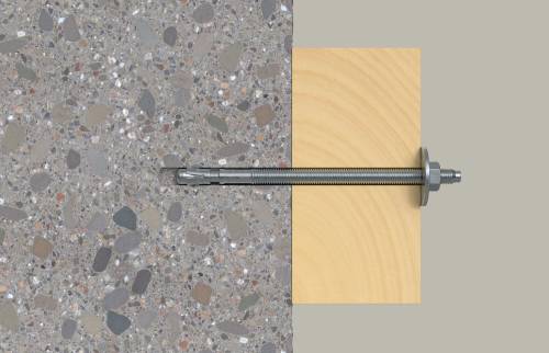 Goujon d'ancrage pour installation traversante et en attente. Le serrage de l'écrou entraîne le cône dans la bague d'expansion et expanse cette dernière contre les parois du trou foré. Le goujon FBN II en acier électrozingué garantit des charges plus élevées dans un béton non fissuré - le support d'ancrage ne permet pas de charges plus élevées. Temps de perçage réduit grâce à une profondeur d'ancrage réduite. La version GS avec rondelle large selon DIN 440 est spécialement conçue pour les constructions en bois.