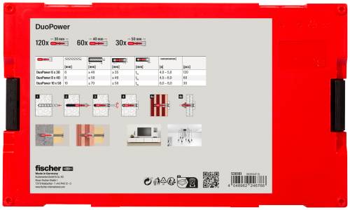 Le coffret fischer FixTainer est un assortiment de chevilles, vis et crochets pratiques et universels pour les applications les plus fréquentes et les matériaux de construction. L'interaction des composants parfaitement adaptés garantit toujours le choix d'une solution de fixation sûre. Grâce au couvercle transparent et aux compartiments, le contenu peut être vu d'un coup d'œil. Cela permet de gagner du temps et garantit le choix de l'élément de fixation approprié. La description de la fonction de la cheville et une vue d'ensemble des matériaux de construction appropriés sur la partie inférieure des FixTainers assurent une sécurité supplémentaire pour l'installation. Le coffret fischer FixTainer est facile à transporter grâce à sa grande poignée. Plusieurs boîtiers peuvent être connectés ensemble avec le système click. Les cloisons amovibles permettent un agencement en fonction des besoins. Séparateurs amovibles. Facile à transporter. Le contenu peut être vu d'un coup d'œil.