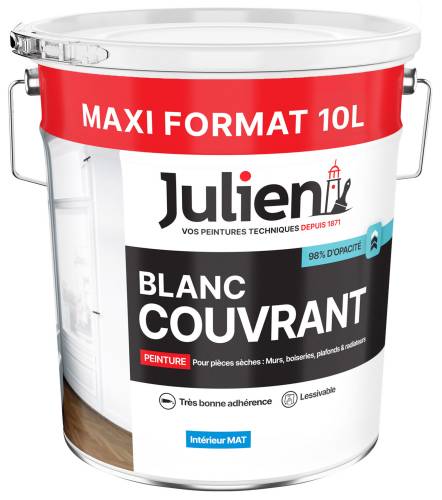 Très bonne couvrance grâce à l'opacité (98%) de sa formule pour un résultat uniforme et un blanc pur. Grâce à la technicité de sa formule, Blanc Couvrant garantit une adhérence optimale sur de nombreux supports intérieurs tels que les murs, les plafonds, les boiseries et les radiateurs. Le Blanc Couvrant Julien s’entretien facilement grâce à sa bonne lessivabilité.