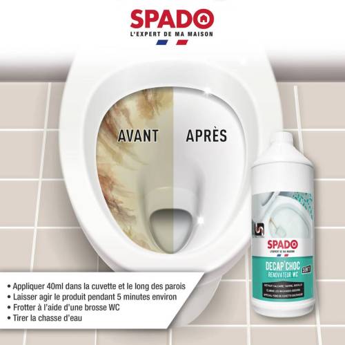 Détruit calcaire, tartre, rouille. Elimine les mauvaises odeurs. Spécial fond de cuvette. Idéal pour la remise en état de vos WC. Vient à bout des traces de rouille et de calcaire au niveau de l’écoulement principal de la cuvette. Nettoie en profondeur. Désodorise et élimine les mauvaises odeurs. Sans risques pour les fosses septiques et les tuyauteries.