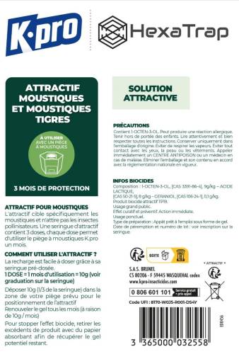 Conçu pour attirer et capturer les moustiques, y compris les moustiques tigres. Grâce à un attractif qui simule la présence humaine, ce piège à moustiques KPRO est efficace pour réduire la population de moustiques dans votre environnement. A utiliser avec le piège électrique à moustiques. Usage extérieur. Jusqu'à 300m². Sans odeur. 1dose = 1 mois d'utilisation. Il y a 3 doses dans la seringue soit 3 mois de tranquillité.