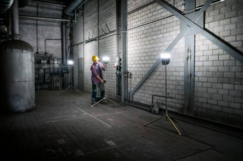Projecteur de chantier LED 50W avec 5m de câble (H07RN-F 3G1,5) avec un éclairage non éblouissant, une diffusion panoramique 360 degrésLampe de chantier LED 360° avec interrupteur, utilisation en extérieur grâce à un indice de protection IP54 (protégé contre la poussière et les projections d'eau), câble RN résistant aux hydrocarbure. Idéal pour les travaux de peinture ou l'utilisation sur les chantiers. Projecteur de chantier LED robuste et stable avec un crochet de suspension et commutable par un interrupteur marche/arrêt disposant de deux modes d'éclairage (100% - 50%)Phare de chantier LED rechargeable avec une puissance de 50W pouvant être posé à l'envers (sur la tête d'éclairage), suspendu ou fixé sur un trépied. IP54. IK08.