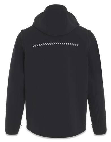 Veste softshell lifestyle 94% polyester recyclé, 6% élasthanne, 310g/m². Ce modèle est doté de manches et d'une capuche amovibles, offrant une grande polyvalence d'utilisation. La veste est imperméable et respirante, fabriquée en polyester recyclé, ce qui en fait un produit écoresponsable. Elle est équipée de sérigraphies visibles de nuit. Le col haut et le dos rallongé offrent une protection optimale contre les intempéries, tandis que le tissu extensible et flexible permet une grande liberté de mouvement. Matière double face déperlante avec membrane imper-respirante 5000mm/3000g/m²/24h. Intérieur en matière polaire noire. 2 poches zippées extérieures à fermetures inversées pour éviter l'intrusion de poussière et 2 poches d'appoint intérieures. Capuche amovible par pressions, manches amovibles par fermetures YKK avec code couleur pour remonter les manches. Produit ecodesign avec une réduction d'au moins 10% de son impact environnemental par rapport à sa version initiale.