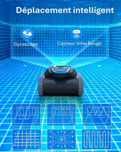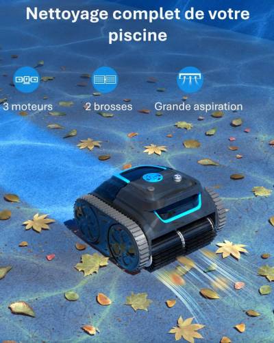 Robot de piscine sans fil compact, autonome et connecté pour un nettoyage complet. Nettoyage prolongé jusqu’à 3h sans interruption. Pour des piscines jusqu’à 110m². Recharge rapide en 2h30. Simple filtration : filtre de 180µm et 3,3 litres avec un accès facile par le haut. 7 programmes de nettoyage adaptés selon vos besoins (fond seul, complet, parois…) pour un résultat sur mesure. Capteur infrarouge. Contrôle via application mobile et connectivité Bluetooth & Wi-Fi. Compatibilité avec toutes les piscines enterrées : s’adapte à toutes les formes (rectangulaire, ronde, libre) et revêtements (liner, carrelage, béton, coque). Automonie de 3h00 batterie pleine.