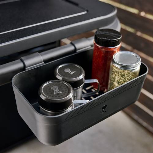 Se clipse facilement sur le rail Weber Works pour garder vos condiments à portée de main. Garde la tablette latérale dégagée pour la préparation et le service. Les trous d’évacuation empêchent les sauces de s’accumuler dans le fond. Passe au lave-vaisselle. Le système Weber Works est utilisable avec les planchas Weber® SLATE et le stand extensible