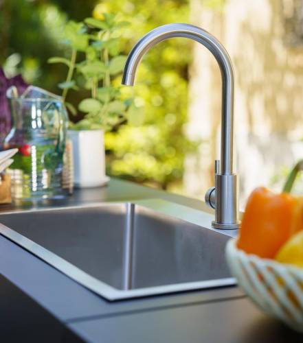 Meuble en acier peinture époxy coloris noir. Évier inox encastré avec mitigeur col de cygne. Portes avec système d’ouverture « push-pull » (une simple pression déclenche l’ouverture de la porte). Pieds réglables en hauteur.