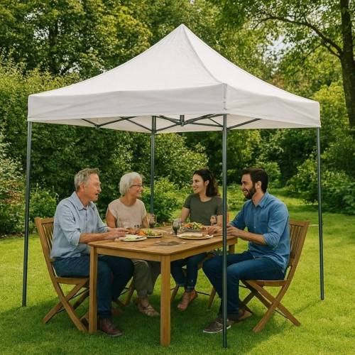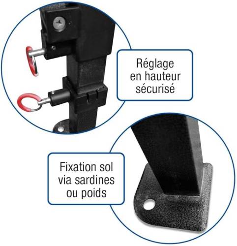 Utilisée sur les marchés, les manifestations associatives, les loisirs, pour les travaux en extérieur, dans les jardins... Toile étanche en polyester de 250g/m² et traitée anti UV 30+ pour une protection optimale. Pieds soudés sur petites plateformes métalliques équipées d'un trou pour une fixation par sardine ou lestage. Pieds télescopiques dont le réglage se fait par goupille de verrouillage sécurisé. Livré avec housse de rangement avec roulettes.