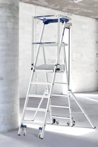 La plate-forme de travail la plus légère du marché version ultra-mobile. Avec ses roues escamotables, elle permet des déplacements sans aucun effort même déployée, pour aller d'une zone de travail à une autre sans être portée. Sécurisée, les 4 roues se rétractent dès l'accès à la première marche. Des roues escamotables Ø75 mm pour faciliter les déplacements déployés. Garde-corps rigide 3 côtés avec sangles anti-chute arrière, avec mise en place semi-automatique. Manipulation aisée. Stabilisateurs à déployer partir du 5 marches. La béquille arrière est étudiée pour passer au-dessus d'obstacles comme des WC (modèles 3 et 4 marches). Marches striées antidérapantes de 80mm, plateforme antidérapante 50x40cm avec plinthes 100mm intégrées. Porte outils compartimenté, résistance 10kg. Répond à la norme européenne EN 131-7, au décret 2004-924 et à la norme PIRL 93 353, décret 2004-924. La plate-forme est comptée comme une marche. Charge maxi 150kg.