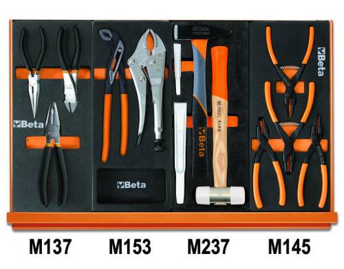 Lot composé de 4 modules pour servante clés mixtes, clés à fourches, clés mâles 6 pans coudées, rallonges angulaires 1/2'', cardan 1/2'', poignée coulissante 1/2'', cliquet réversible 1/2'', douilles 6 pans avec carré conducteur femelle 1/2'', pince coupante, pinces à becs, pince étau, burins, maillet, marteau, pinces circlipsmètre, mini scie à méteaux, cutter avec lame, embouts, rallonge porte-embouts magnétique, porte-douilles pour visseuses, limes demi-douces...