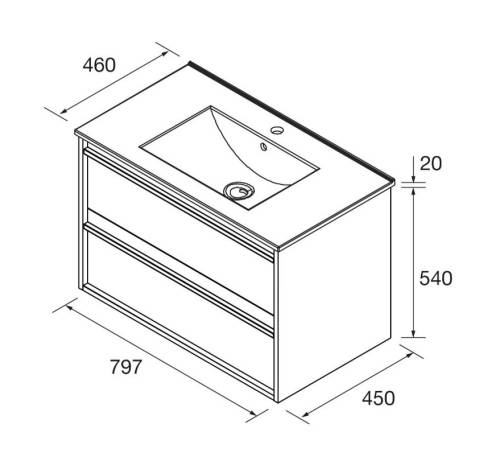 Meuble de salle de bain à 2 tiroirs avec fermeture à frein amorti pour une fermeture toujours douce. Poignée caractéristique de la série en noir mat. Avant et côtés fabriqués en panneau de particules stratifié de 16 mm (classe E-1) avec des bords en PVC (avec colle PUR). Le plan 1 vasque en porcelaine blanche assure une résistance maximale à l'usure. Fermeture amortie. Séparateur de rangement inclus. Livré sans mitigeur ni bonde.
