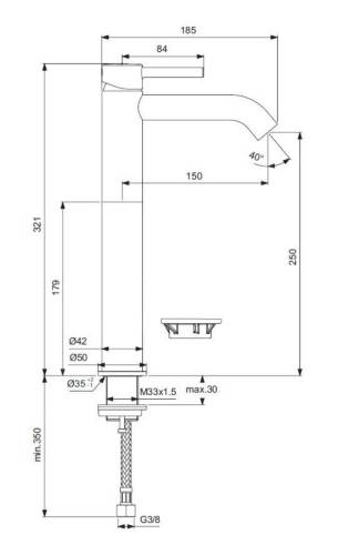 Bec fixe. Aérateur avec limiteur de débit 5L/min max. Cartouche diamètre 28mm disque céramique à limiteur de température. Flexibles d'alimentation 35cm. Fixation Easyfix. Hauteur sous aérateur 250mm. Hauteur totale 321mm. Projection 150mm.