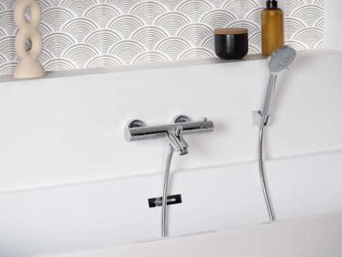 Corps en laiton. Montage mural, entraxe 150 mm. Cartouche thermostatique. Tête céramique 1/2 tour. Sortie douche M15x21 (1/2''). Aérateur mousseur M28x100 anti-calcaire. Réglage de la température avec bouton de sécurité anti brûlure à 38°C. Inverseur automatique. Raccords excentrés et rosaces fournis. Deux filtres et clapets anti retour incorporés. Garantie 5 ans.