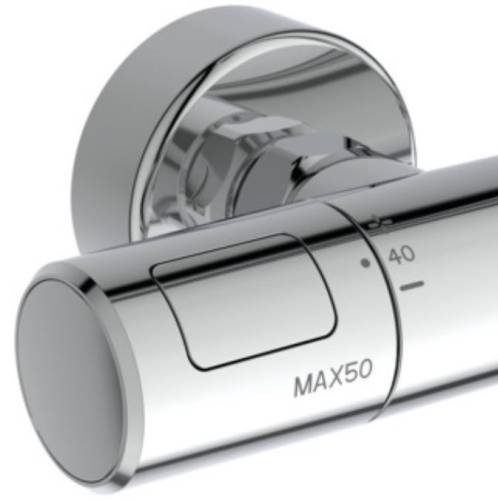 Douche de tête 250 mm. Débit 8 l/min. Douchette 100 mm 3 jets. Flexible anti-torsion 1,75 m. Inverseur dans la poignée, butées à 50 % du débit et à 40°C, corps tiède. Température maximum 50°C. Dimensions : 315x505.5x1117mm.