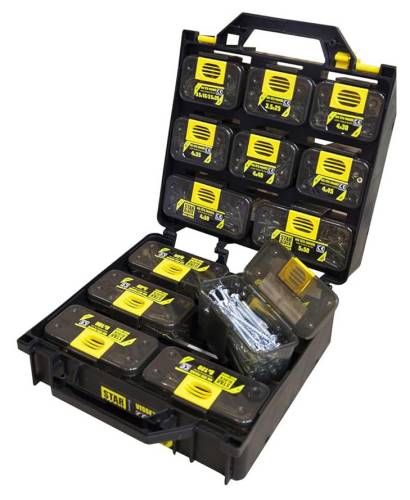 Composition : 150x 3,5x16mm – 150x 3,5x20mm – 150x 3,5x25mm – 150x 4x30mm – 100x 4x35mm – 100x 4x40mm – 100x 4x45mm – 100x 4x50mm – 100x 5x50mm –50x 5x60mm – 50x 5x70mm – 50x 5x80mm – 50x 6x80mm – 25x 6x100mm – 25x 6x120mm – 1 porte-embouts avec 5 embouts.