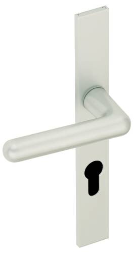 Avec piliers taraudés intégrés et vis invisibles côté extérieur. Pour épaisseur standard de 40 mm et serrure entraxe 70 mm. Ensemble monobloc : béquille et plaque solidarisées. Plaque renforcée avec sous-plaque en polyamide chargé à 60% en fibre de verre. Version avec plaques étroites largeur 28 mm pour portes-fenêtres - Fixation invisible côté extérieur par 2 vis M4 traversantes. Entraxe 195mm.