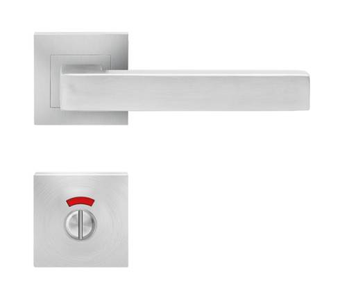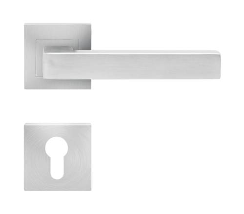 Rosaces angulaires et brevetées à trois pièces avec ergots de fixation 7 mm et bague coulissante en nylon. Fixation définitive par vissage de la bague de finition, plus ressort de rappel. Vis traversantes M4. Fixation invisible. Carré 7 mm avec perçage décentré. Epaisseur de porte standard: 37 - 43mm. Diamètre de poignée: 22mm.