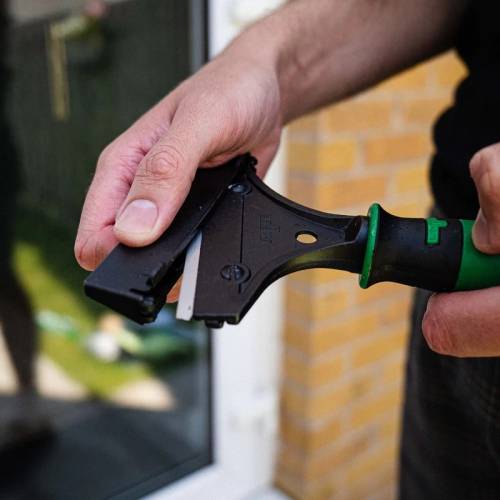 Le grattoir de surface ergonomique. Avec poignée en deux parties. Poignée en plastique agréable. Tête métallique solide, inclinée. Lame avec côté coupant & non-coupant.