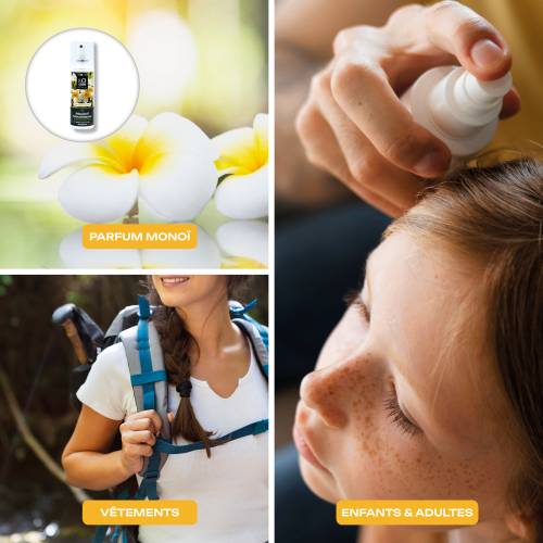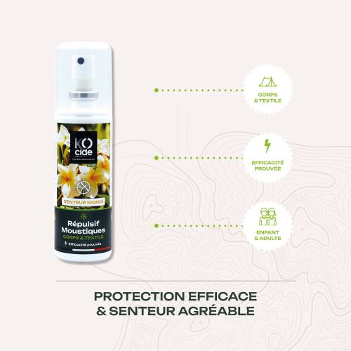 Le répulsif moustiques K-OCIDE est un produit efficace contre les insectes piqueurs tels que les moustiques, les taons, les puces et les tiques. Il offre une protection durable jusqu'à 6 heures et laisse un parfum exotique de monoi, idéal pour vos voyages ou sorties estivales. Convient aux enfants à partir de 1 an.