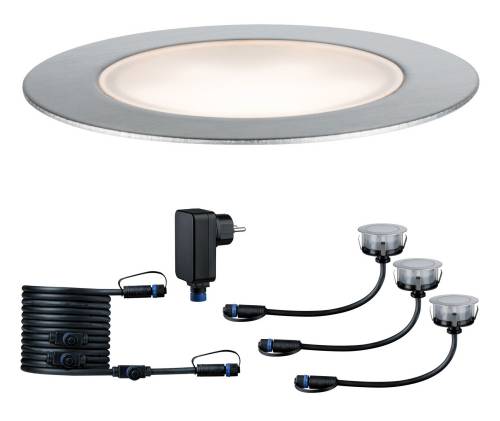 Les spots encastrés dans le sol Plug & Shine Floor agrémentent les allées, entrées et terrasses de points lumineux décoratifs dans un ton blanc chaud. Le kit de démarrage se compose de trois luminaires, un transfo prise et un câble de raccordement à trois prises. Veillez à fermer les sorties inutilisées avec les caches fournis afin de garantir la protection contre les immersions IP65. Vous avez la possibilité d'étendre le système en ajoutant encore d'autres composants Plug & Shine. Kit de démarrage Plug & Shine comprenant 3 luminaires, 5 mètres de câble de raccordement et un transfo.