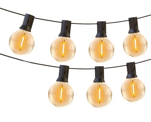 Guirlande de 10 douilles G40, E12. IP44 pour l'intérieur et l'extérieur. 2700K. Vendu avec 11 ampoules. Panneau solaire fourni.