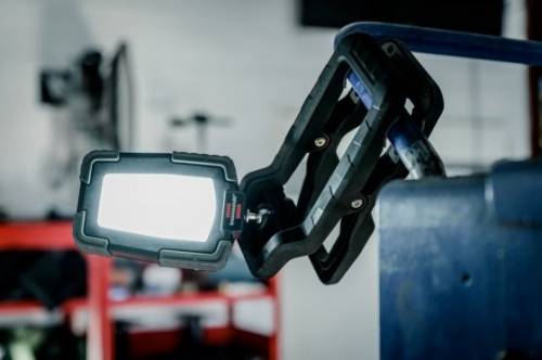 Lampe de chantier LED avec pince (écartement du dispositif d'accrochage 55mm max.) , une liberté de mouvements accrue en atelier, hangar agricole ou sur chantier pour bricoleurs et artisans exigeants. Projecteur de chantier avec pince, dispositif d'accrochage performant. De plus, l'orientation du projecteur peut être réglée dans toutes les directions, à près de 360°, grâce à la rotule articulée. Spot de chantier LED avec 3 modes d'éclairage (100% - 50% - 25%) , 12h d'autonomie max., USB avec powerbank (batterie externe/de secours) pour recharger des appareils comme smartphones, tablettes... Projecteur de chantier LED robuste avec boîtier résistant aux chocs, batterie Li-Ion intégrée rechargeable avec témoin de charge et prise-chargeur USB type A/C. Phare de chantier LED à pince de fixation, mobile et puissant - possibilités d'accroches faciles aux tracteurs agricoles, machines agricoles et engins de chantier. Indice de résistance aux chocs : IK08.