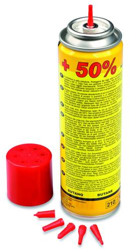 Cartouche de gaz pour recharger ls briquets et autres appareils rechargeables avec 6 adaptateurs différents.