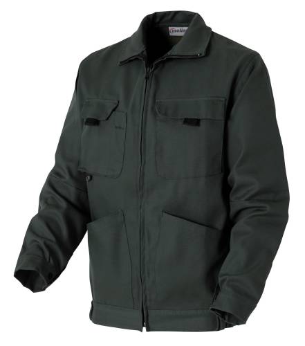 Blouson croisé 2/2, 60% coton, 40% polyester, 315g/m². Col cheminée. Emmanchures raglan dos. Poignets rapportés réglables par 1 pression plastique à calotte double positionnement. 1 pince coude. 1 poche poitrine devant droit à soufflet, rabat fermé par un ruban auto-agrippant. Poche comportant un compartiment crayon. 1 poche poitrine devant gauche plaquée, rabat fermé par un ruban auto-agrippant. 2 poches basses plaquées, ouvertures obliques. Fermeture milieu devant par glissière sous lèvres. Ceinture rapportée élastiquée sur les côtés. Boutons pressions plastiques et fermeture à glissière spiralée avec curseur plastique.