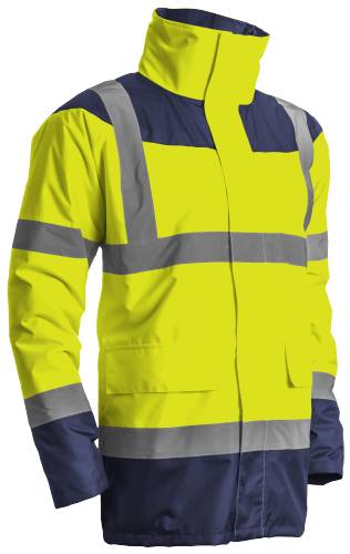 Tissu 100% Polyester Oxford 300D fluorescent enduit PU, coutures étanchées. Doublure fixe matelassée 100% Polyester. Empiècements bleu marine aux épaules, bout des manches et bas du parka. 2 bandes bretelles + 2 bandes ceintures microbilles rétro-réfléchissantes. Fermeture à glissière centrale avec double curseur. Rabat avec scratch sur zipper central jusqu'en haut du col. 2 poches basses avec doublure polyester épais. Capuche 3 pans intégrée, oeillets d'aération sous les bras. Poignets tricot dans les manches, trappe d'accès pour sérigraphie. 1 poche téléphone intérieur droit + 1 poche portefeuille intérieur gauche. Etiquette d'identification côté intérieur gauche.