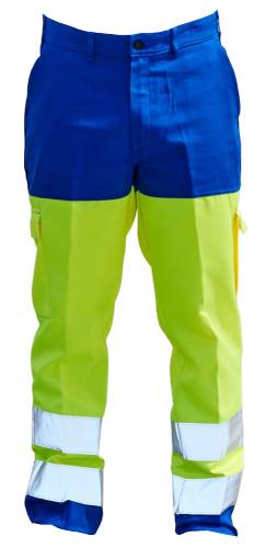 Tissus fluorescent 80% polyester, 20% coton, 280g/m², tissu de contraste 60% coton, 40% polyester, 310g/m². Ceinture élastiquée, dos réglable, braguette zip, 2 poches italiennes, 1 poche plaquée jambe droite avec rabat velcro, 1 poche smartphone (9x17cm) sur jambe gauche, 1 poche arrière. Entrejambe 82cm + ourlet de 5cm.