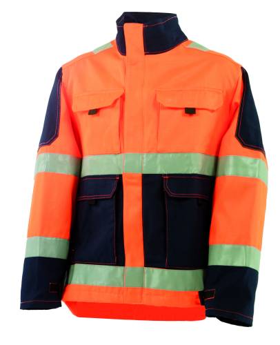 Blouson 55% coton, 45% polyester, 300g/m², contraste sergé 65% polyester, 35% coton, 300g/m². Devant fermé par fermeture à glissière sous patte maintenue par pressions cachées. Soufflets dos. Bas dos dépassant. Poignets réglables par patte de serrage avec velcro. Bandes de 50mm rétro-réfléchissantes. Poches poitrine à soufflet sous rabat fermé par velcro avec lacette. Poches basses à double entrée sous rabat fermé par velcro avec lacette. Système de fixation intérieur pour gilet polaire amovible. Surpiqûres fluo. Entretien ménager.