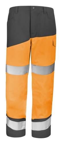 Pantalon 55% coton, 45% polyester, 300g/m². Ceinture élastiquée côtés, collerette de marquage intérieure. Braguette fermée par fermeture à glissière et bouton clou à la ceinture. Poches cavalières, poche cuisse à soufflets sous rabat fermé par grippers cachés, poche dos plaquée, poche mètre avec bas volant. Bandes de 70mm rétro-réfléchissantes. Entrejambe 80cm avec ourlet de 5cm. Entretien industriel.