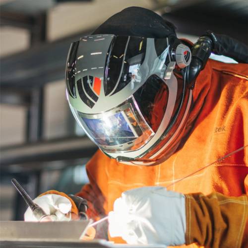 La cagoule soudeur ventilée Weltek combine la cagoule soudage automatique Radikal et l'appareil de ventilation assistée Airkos P. Sous visière incolore ergonomique à face avant relevable qui incorpore la cellule automatique SR True Colors et les visions latérales. Facilement relevable grâce à la gâchette latérale et une semi-assistance automatique. Recommandée pour le soudage à l'arc, MIG/MAG, TIG, meulage et coupage. La cagoule possède 4 capteurs d'arc, la vision latérale teinte DIN 5 pour un angle de vision de 160°C et une cellule SR Vision True Colors qui assure clarté, vision naturelle et détaillée, contrastes et restitution optimale des couleurs. L'unité de filtration Airkos assure une excellente étanchéité, 2 débits d'air et des alarmes sonores. Elle est équipée d'un filtre TH3PRSL pour les particules solides et liquides. Autonomie 9 à 10 heures.