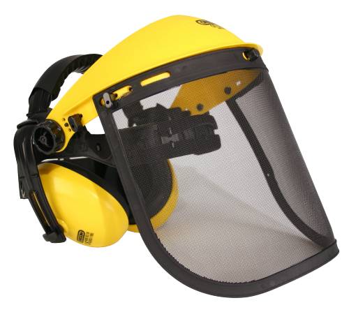 Protection du visage et de l'audition lors des travaux de débroussaillage. Casque anti-bruit plastique avec un rembourrage en mousse à l’intérieur. Visière en maille métallique. Bandeau avec réglage à un seul point.