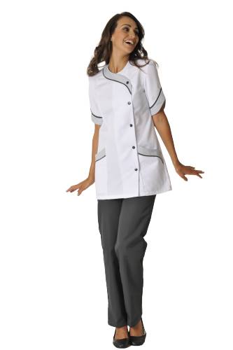 Tunique 65% polyester 35% coton. Col parement et biais contrastés. Manches courtes avec parement et biais contrastés. Deux poches basses avec parement et biais contrastés. Fermeture centrale par 5 pressions.