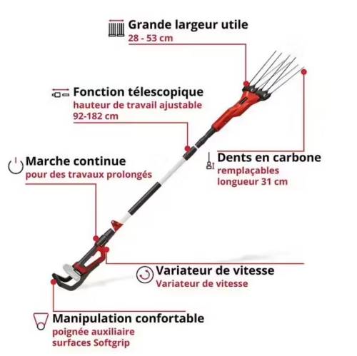 Cet appareil léger et maniable permet de faire tomber tous les fruits ou olives grâce à la puissance d’une batterie. Le secoueur d’olives/de fruits sans fil fait partie de la gamme Power X-Change, dans laquelle les batteries, chargeurs et appareils peuvent être combinés en toute flexibilité. Le râteau collecteur opère un mouvement latéral constant dans les branches et couvre une largeur utile allant de 28 à 53 cm. Les 8 dents en carbone solides d'une longueur de 31 cm font tomber les fruits ou olives des branches. Une molette rotative permet de régler sa vitesse de déplacement. Chaque dent en carbone se remplace facilement. Pour atteindre sans difficulté les branches très hautes, la longueur totale de cet appareil électrique peut être réglée entre 220 et 310 cm grâce à la fonction télescopique. La poignée auxiliaire arrière facilite en outre l’accès aux branches hautes. Associées à la fonction de marche continue, les surfaces Softgrip, qui assurent une manipulation confortable, soulagent l’effort lors d’une utilisation prolongée. La sangle de transport réglable permet une répartition optimale du poids. Un support mural très pratique est inclus de série pour un rangement peu encombrant de l’appareil. Moteur à charbon. Batterie et chargeur non inclus (accessoires disponibles séparément, notamment dans le Starter Kit très pratique).
