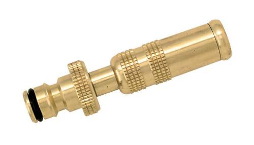 Fixation du tuyau à l'aide d'un collier de serrage. Jet réglable par simple rotation de la tête de lance.