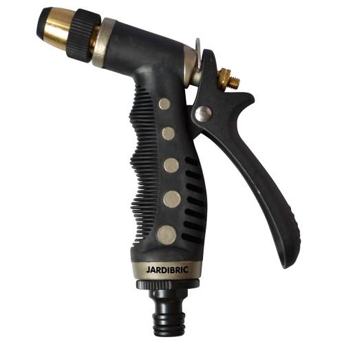 Poignée moulée. Possibilité de blocage de la gâchette pour un arrosage sans effort. Embout automatique intégré démontable.