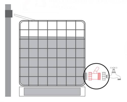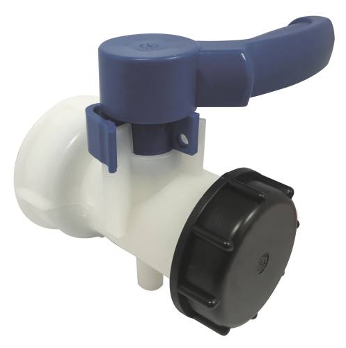 Vanne plastique pour cuve grillagée/IBC 1000 litres (Sortie cuve Ø60 - Sortie vanne Ø 60). Matière : PEHD, joint EPDM. Garantie 2 ans hors gel.
