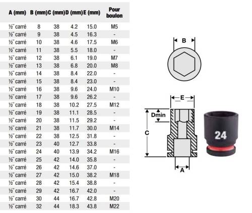 L'acier (Chrome-Mobybdène) SHOCKWAVE™ IMPACT DUTY est un alliage en acier de haute qualité qui fournit une force extrême et une grande durabilité. Meilleure adaptation grâce aux 6 points de fixation. Aucun glissement grâce à sa géométrie hexagonale pour protéger la forme de la douille et de l'écrou. Construction à parois affinées pour un meilleur accès. Marquage du diamètre estampée et rempli d'encre numéro de pièce gravé au laser. Double trou pour les associer avec les accessoires de sécurité.