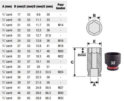 L'acier (Chrome-Mobybdène) Shockwave Impact Duty est un alliage en acier de haute qualité qui fournit une force extrême et une grande durabilité. Meilleure adaptation grâce aux 6 points de fixation. Aucun glissement grâce à sa géométrie hexagonale pour protéger la forme de la douille et de l'écrou. Construction à parois affinées pour un meilleur accès. Marquage du diamètre estampée et rempli d'encre numéro de pièce gravé au laser. Double trou pour les associer avec les accessoires de sécurité.