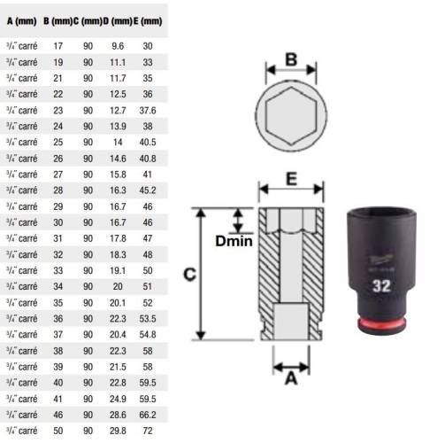 L'acier (Chrome-Mobybdène) Shockwave Impact Duty est un alliage en acier de haute qualité qui fournit une force extrême et une grande durabilité. Meilleure adaptation grâce aux 6 points de fixation. Aucun glissement grâce à sa géométrie hexagonale pour protéger la forme de la douille et de l'écrou. Construction à parois affinées pour un meilleur accès. Marquage du diamètre estampée et rempli d'encre numéro de pièce gravé au laser. Double trou pour les associer avec les accessoires de sécurité.