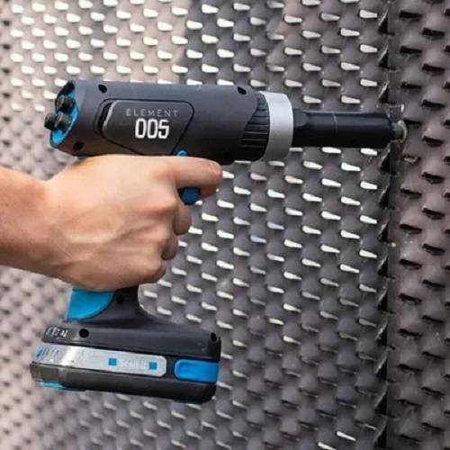 Un rendement et un confort incomparables avec vos pinces manuelles. E-005 simplifie grandement et à moindre coût, la pose des rivets standards alu ou acier (Ø2,4 - 3,0/3,2 - 4,0 - 4,8/5,0mm) ou inox (Ø2,4 - 3,0/3,2 - 4,0). Un seul coup de gâchette permet ensuite de réaliser le cycle complet de l’opération, sans aucun effort. Son moteur BRUSHLESS sans charbon augmente la longévité de l’outil, améliore le rendement et réduit les nuisances sonores. Dimensions compactes pour une accessibilité aux endroits les plus exigus, poids léger pour gagner en rendement avec un minimum d’efforts physiques. La tête des outils ELEMENT, équipée de 3 LED, éclaire la zone de travail avec précision. Garantie 1 an.