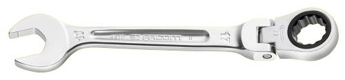 Clés mixtes à cliquet à tête articulées : permettent d'atteindre les écrous difficiles d'accès. Mécanisme à cliquet compact et réversible par retournement de la clé. Angle de reprise à 5°. Tête oeil articulée à 180°. Tête fourche inclinée à 15°. Finition chromée satinée.