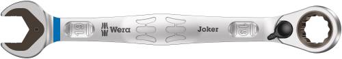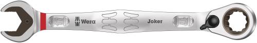 Clé mixte à cliquet Joker coudée côté cliquet et à levier d’inversion. Avec fonction de retenue assurée par une plaque métallique implantée dans la fourche, réduisant le risque d’égarer vis et écrous. La butée terminale intégrée est à même d’empêcher le glissement vertical hors de la tête de vis et permet le déploiement de couples élevés. La plaque métallique interchangeable située dans la fourche bloque les vis et les écrous grâce à ses dents extra-dures et diminue le risque de ripage. La morphologie dodécagonale engendre une liaison géométrique intime avec la vis ou l’écrou, réduisant le risque de ripage. L’angle de reprise de 30° seulement côté fourche permet d’éviter le retournement laborieux de la clé lors du vissage. e de reprise de 30° seulement côté fourche permet d’éviter le retournement laborieux de la clé lors du vissage. Mécanisme à inversion du cliquet à denture exceptionnellement fine (80 dents) côté oeillet, offrant un maximum de souplesse même aux endroits exigus. Précision du mécanisme du cliquet audible au déclic. Le robuste élément d’encliquetage en deux parties assure en outre une extrême stabilité. Côté cliquet coudé à 15° pour des travaux sûrs à couples élevés. Le forgeage à géométrie spécialement étudiée assure une transmission de couple élevée et une haute résistance à la flexion. Réalisation en acier chrome-molybdène performant, avec revêtement nickel-chrome pour une haute tenue à la corrosion. Avec repéreur d’outils «Take it easy» d’identification des calibres par couleur.