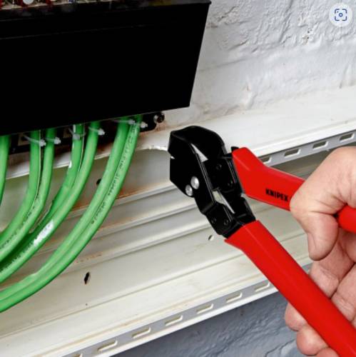 Pince spéciale pour découper des encoches dans des plinthes et boîtiers en plastique dans le domaine de l'installation électrique et sanitaire. L'encoche peut être agrandie à volonté en coupant plusieurs fois. Bords de coupe nets, le profil découpé ne nécessite aucune finition. Manipulation facile. Avec ressort d'ouverture, limitation d'ouverture et système de verrouillage. Poids 414g.
