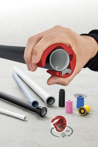 Coupe-tube pour les tubes en plastique et les manchons d’étanchéité. Coupe nette en un seul mouvementCompact. Polyvalent. Rapide.Outil pratique pour les plombiers et les électriciens : coupe les tubes en plastique et les manchons d’étanchéité rapidement et efficacement. Coupe-tube intelligent : coupe les tubes sans copeau et tient confortablement dans la main. Peut couper les tuyaux d’écoulement en plastique à haute température et les conduits électriques en un rien de temps. Peut être utilisé pour couper les manchons d’étanchéité pendant l’assemblage final – près des parois, conforme aux normes. Coupe les tubes en plastique non renforcé de Ø 20 à 50 mm avec une épaisseur de paroi jusqu’à 2,4 mm. Coupe les tubes rapidement, proprement et sans copeau. Coupe les manchons d’étanchéité à environ 2 à 3 mm des parois. Bloc lame rotatif pour couper les tubes en plastique (lame au centre)ou les manchons d’étanchéité (lame à l’extrémité). Avec mécanisme de verrouillage pour un transport sûr. Deux lames de rechange intégrées dans l’outil. Outil en plastique renforcé stable, bloc lame en zinc moulé sous pression. Lames en acier inoxydable chirurgical spécial.