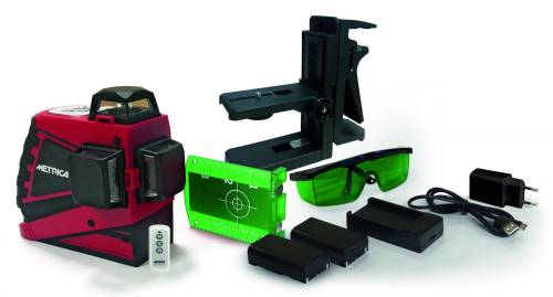 Projette 3 plans laser à 360°: un plan horizontal et deux plans verticaux à 90 ° les uns des autres. 4 équerrages aux murs. 2 croix, une au plafond et une sur le sol externe à la base de la structure pour le fil à plomb toujours visible. Positionnement facile au plafond (< 2 cm). Utilisation intérieure et extérieure (avec récepteur non inclus). Clignotement automatique du laser et avertissement sonore si l’appareil est hors de la plage d’auto-nivellement. Système de blocage intégrée pour éviter les vibrations lors du transport, possibilité de projeter les plans laser également dans une position inclinée fixe. Forme compacte, revêtement en caoutchouc antidérapant pare-chocs. Pile rechargeable Li-ion pour une longue durée ainsi qu'une pile de rechange et un chargeur pour la charge externe. Port USB-C intégré à l'instrument. Indicateur LED de charge de la batterie. Télécommande. Support mural magnétique. IP54. Rechargeable par USB.